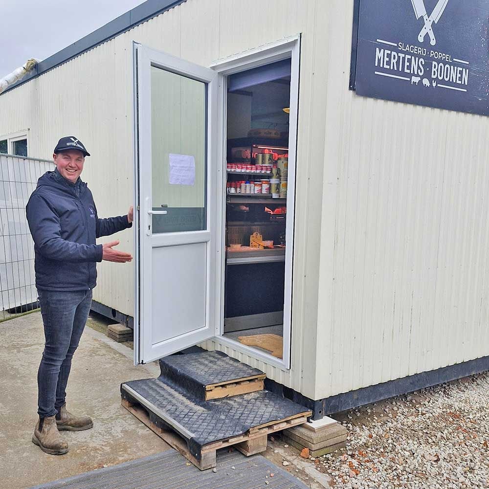 Tijdens de werken blijft de slagerij gewoon open, al gebeurt de verkoop tijdelijk vanuit een winkelcontainer achter het gebouw. Niet elke klant vindt meteen de weg ernaartoe, daarom nog even praktisch: