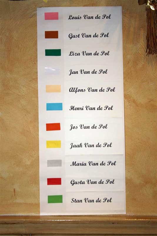 Van de elf kinderen zijn enkel Maria en Stan nog in leven. Ook de vrouw van Rie, Jos, Jaak en Stan, zaten mee aan tafel . Dit jaar vierden we met 294 deelnemers ons negende feest. We zijn ermee gestart in 1973. Elke stam heeft zijn verantwoordelijke. Zo blijven we op de hoogte van wat er leeft. Samen met de verantwoordelijken organiseerde Karel Bols-Van de Pol deze feestelijkheden.